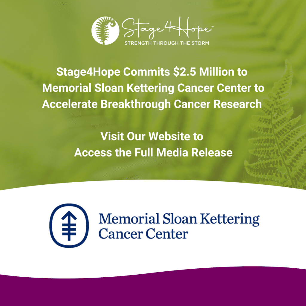 Stage4Hope is proud to announce a $2.5 million multi-year research commitment to Memorial Sloan Kettering Cancer Center (MSK), one of the world’s premier cancer research and treatment institutions. This commitment will help accelerate groundbreaking research to expand treatment options and precision therapies, offering new hope to patients with advanced-stage cancers.